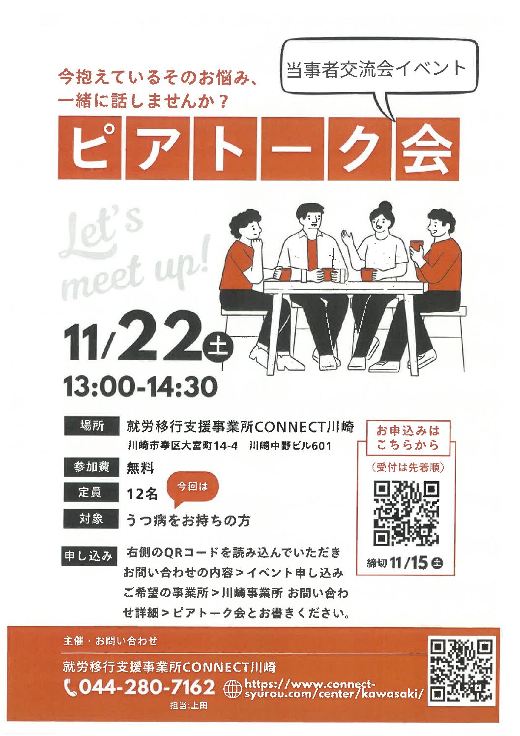 さて、先週になりますが就労移行支援事業所CONNECT川崎さまから【ピアトーク会】の開催のお知らせを頂きました。今回の対象者はうつ病をお持ちの方です。ご興味ある方、ぜひ参加してみてください。